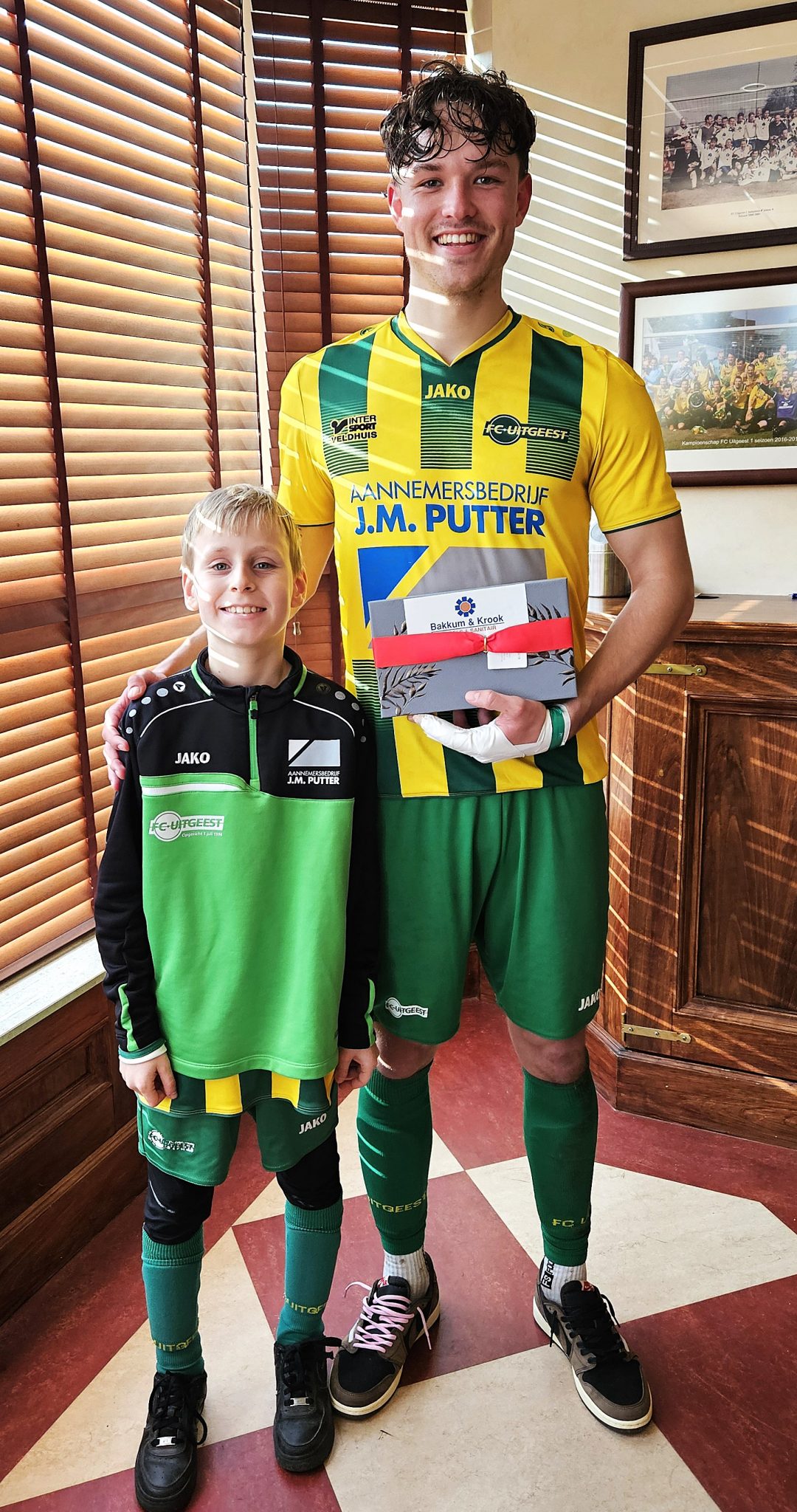 Daan is één van de spelers die bij FC Uitgeest het verschil kunnen maken. Dat doet hij dan ook regelmatig door te scoren of een beslissende assist te geven. Soms met links, soms met rechts, soms snoeihard en soms met een slim balletje. Vandaag in de 88e minuut was het laatste aan de orde. Een lepe inzet liet keeper Quaars kansloos en redde voor FCU vandaag een punt. Gefeliciteerd Daan. Hier op de foto met de pupil van de week Jamie Spakman van JO 10-3.